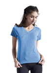 Short sleeve v-neck. Modern fit in feminine contoured design. Inherent moisture wicking to keep you dry and comfortable. Treated with BodyFreshe to inhibit the growth of odor causing bacteria. Breathable. No shrinkage, easy care. Tear away label. 100% Cationic disperse heather micro polyester. S - 2XL